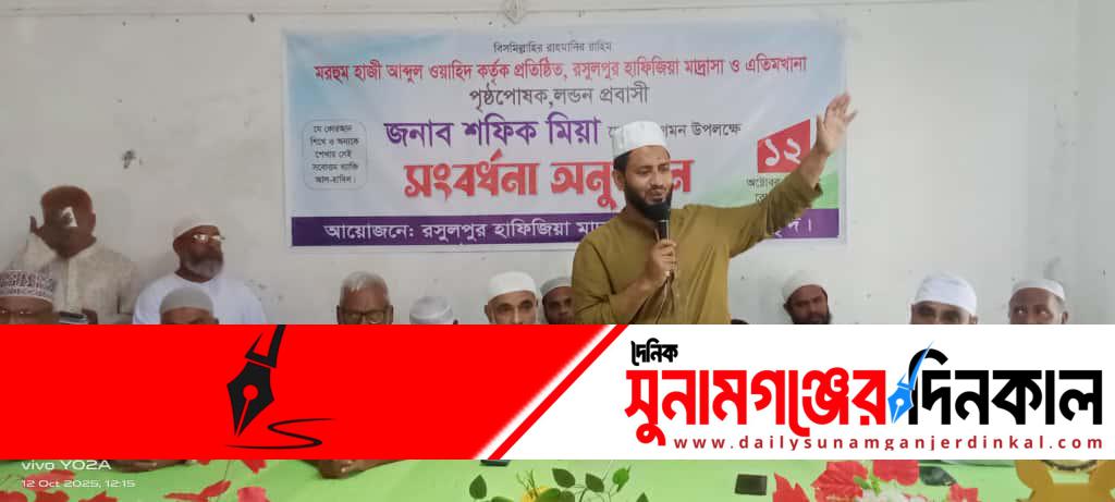 সুনামগঞ্জের শান্তিগঞ্জ উপজেলার দর্গাপাশা ইউনিয়নের আক্তাপাড়া রসুলপুর গ্রামের মরহুম হাজী আব্দুল ওয়াহিদ কর্তৃক প্রতিষ্ঠিত, রসুলপুর হাফিজিয়া মাদ্রাসা ও এতিমখানার পৃষ্ঠপোষক লন্ডন প্রবাসী শফিক মিয়া দেশে আগমন উপলক্ষে সংবর্ধনা অনুষ্ঠান অনুষ্ঠিত হয়।
