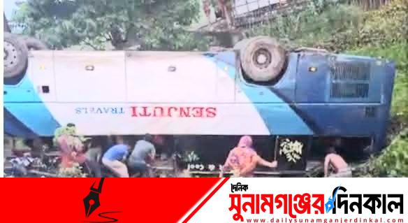 পুলিশ ও স্থানীয় সূত্রে জানা গেছে, ঢাকা থেকে ছেড়ে আসা সুনামগঞ্জগামী সেন্জুতি ট্রাভেলসের একটি এসি বাস (রেজি. নং ঢাকা মেট্রো ব-১৫-৬০৮২) নিয়ন্ত্রণ হারিয়ে রুহুল আমিনের বাড়ির সামনে রাস্তার পাশে খাদে পড়ে যায়। এতে ঘটনাস্থলেই দুইজন নিহত হন এবং অন্তত ১০ জন যাত্রী আহত হন।